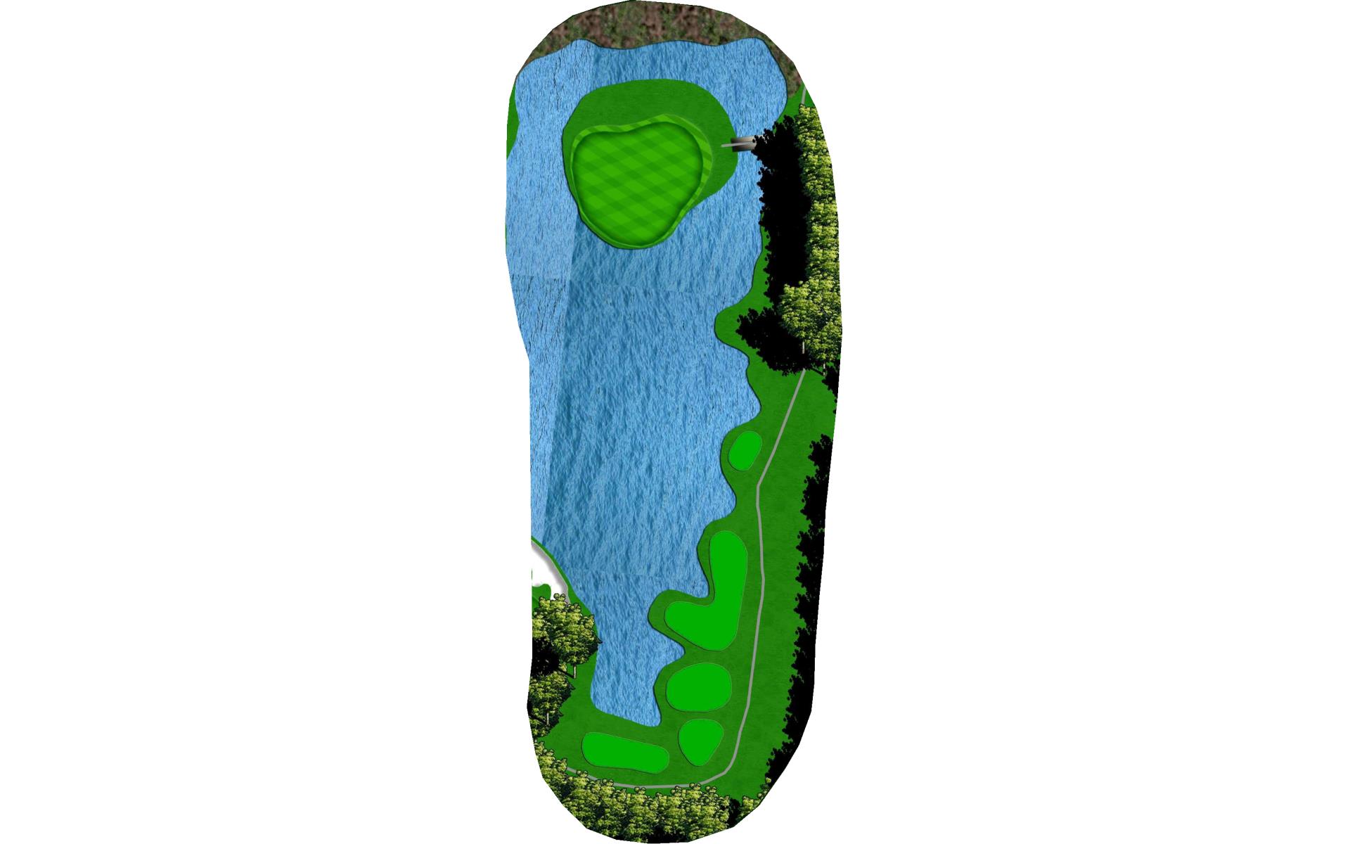 The finishing hole is a par 5 that requires players to hit the fairway if they want to go for the green in two. Rolling terrain slopes towards the water down the right side of the hole. This green is surrounded on three sides by water and the fourth by a bunker.